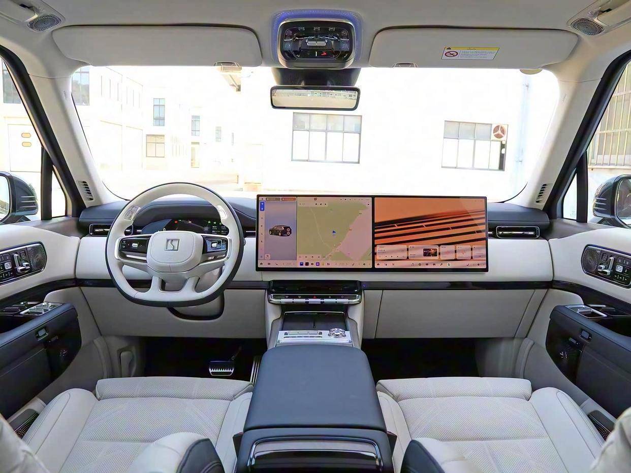 来到车内,你会发现内饰风格十分“理想”,配备了13英寸液晶仪表盘、16英寸3.5K中控屏幕、16英寸3.5K副驾娱乐屏幕以及47英寸AR-HUD投屏,内饰设计显得很有科技感。