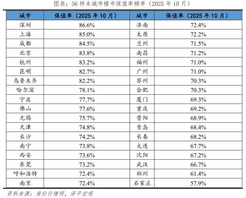 全国36个重点城市,过去十年深圳的房地产保值率排第一,上海、成都位列前三,北京、杭州也冲进前五,他们的保值率都超过80%。反观有些三四线城市,比如鹤岗、廊坊,保值率早就跌破60%,当年买的房子现在打半价都很难出手。