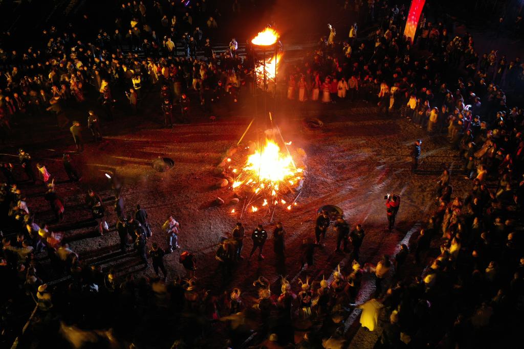 3月3日,在甘肃省陇南市文县铁楼藏族乡草河坝村,当地群众和游客一起跳火圈舞(无人机照片)。新华社记者 范培珅 摄